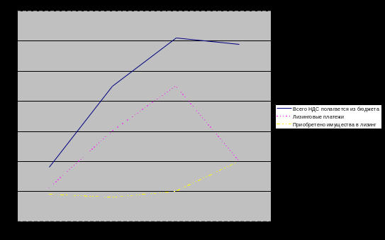 Падение величины НДС к зачету в 2005 году объясняется значительным ростом лизинговых платежей (см. рис.3), что стало причиной увеличения НДС к уплате в бюджет. В дальнейшем, по мере увеличения объемов закупаемого имущества в лизинг величина НДС к зачету плавно возрастает.