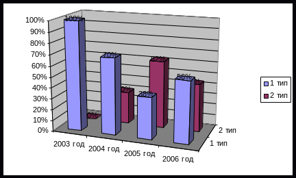 Из рисунка 8 четко прослеживается тенденция сокращения доли лизинговых сделок 2 типа ("серый" лизинг) и соответственно увеличения доли сделок 1 типа. В 2006 году значительно сократились сделки 2 типа относительно сделок 1 типа, что свидетельствует о позитивной тенденции тяготения лизинговой компании к сделкам финансового лизинга. Однако, основываясь лишь на количестве заключенных сделок, нельзя объективно судить о структуре лизинговых сделок по типам. Основываясь на сумме лизинговых платежей согласно заключенным договорам лизинга, структура лизинговых сделок по типам выглядит следующим образом (см. рис.9).