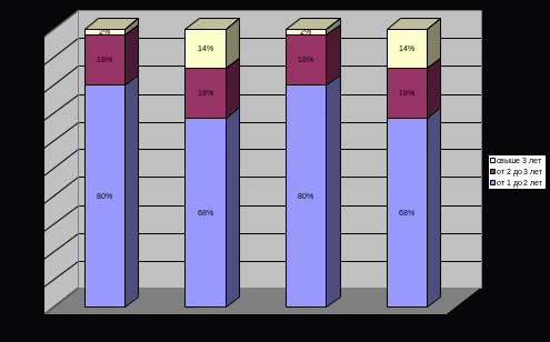 Структура лизинговых сделок по срокам характеризуется следующим образом: стабильно держится на уровне 16-19% доля сделок со сроком от 2 до 3 лет (оборудование, легковые автомобили стоимостью свыше 300 т. р.); сделки со сроком свыше 3 лет (специальная техника, АЗС) занимали значительную долю (47,6%) в 2004 г., резко снизилась их доля в 2005 г. и в следующие годы постепенно возрастала до 28,9%; сделки со сроком от 1 до 2 лет начали заключаться преимущественно с 2005 г. (компьютерная техника, легковые автомобили стоимостью меньше 300 т. р.).