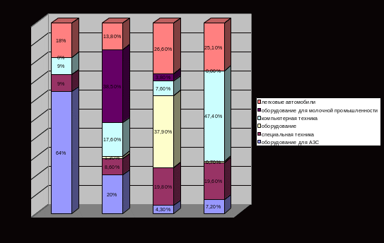 Таким образом, в первом году своего существования компания преимущественно передавала в лизинг оборудование для АЗС (63,5%), что связано с тем, что основным клиентом в то время было ОАО "Удмуртнефтепродукт", но начиная с 2004 года доля данного вида имущества, передаваемого в лизинг, резко сокращалась - ОАО "Удмуртнефтепродукт" оснастил строящиеся и существующие АЗС в полном объеме, необходимость в оборудовании для АЗС практически отпала. Достаточно стабильно передавалась в лизинг специальная техника (автокраны, грузовые автомобили, бензовозы и т.д.) - ее доля не снижалась ниже 7%. Подобную же тенденцию демонстрирует компьютерная техника. Оборудование для изготовления молочных продуктов активно приобреталось лишь в 2005 г. (от 40% до 50% в общем объеме) - в 2005 г. оно приобреталось исключительно для "Х", В диапазоне от 13% до 27% постоянно приобреталась компьютерная техника.