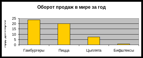Гамбургеры, конечно, в фаворитах: оборот их продаж в мире составляет 23,7 миллиарда долларов в год. Затем идут мировые операторы пиццы, их оборот превышает 20 миллиардов долларов в год. Дальше следуют цыплята - 7,3 миллиарда долларов. Ну и замыкают цепочку бифштексы - свыше 900 миллионов долларов в год.