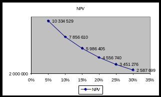 Проанализировав результаты расчета показателей экономической эффективности для трех сценариев реализации проекта можно сделать вывод, что все три варианта являются жизнеспособными, т.к. все показатели оказались в рамках нормы (NPV положительная, IRR превышает предполагаемую при расчете NPV ставку сравнения, По показателям лучший вариант – оптимистичный, однако в реальной жизни он мало вероятен. Гораздо ближе к реальности пессимистичный вариант.