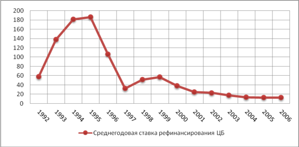 Рисунок 8 Изменение ставки рефинансирования ЦБ РФ в 1992 – 2006 гг.