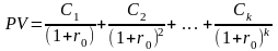 Итак, теперь можно посчитать все потоки, за срок сравнимый со сроком лизинга и сравнить их. Тут, как и в предыдущем случае, интерес представляет распределение потоков по времени и их приведённая стоимость. Однако, в отличии от лизинговых платежей, выплаты по кредиту как правило отличаются месяц от месяца, т.к. компании выгодно привлекать кредит на условиях ежемесячных или ежеквартальных выплат с начислением процентов на остаток долга. В этом случае компания будет иметь минимальные переплаты за приобретаемый объект, связанные с начислением процентов. Тогда для дисконтирования по ставке r0о формула будет иметь следующий вид: