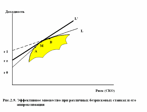 , участок АВ - это участок эффективного фронта Марковица, а прямая BL означает получение кредита по ставке