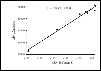 Користуючись тим, що активаційні параметри отримані як при варіюванні кислоти, так і при варіюванні каталізатора, представляється можливим побудувати єдину ізокінетичну залежність у координатах ΔН≠=f(ΔS≠) для розглянутих вище реакційних серій, яка носить прямолінійний характер з коефіцієнтом кореляції r=0,990, що свідчить про наявність єдиного механізму реакції за даних умов.