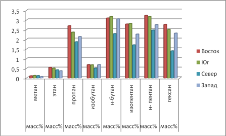 Из диаграммы, составленной по таблицам 4 и 5 видно, что наибольшее содержание углеводородов С1-С6 наблюдается на юге и востоке области. Следовательно, нефть в этих районах более легкая, в меньшей степени требующая доочистки.