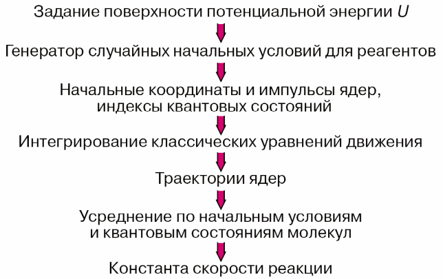 На рисунке 3 изображены последовательные стадии вычислений методом классических траекторий. Реализация подобной схемы на современных компьютерах позволяет вычислять константы скорости реакций с существенно большим числом атомов, нежели при полностью квантовом описании [5,6].