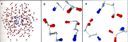Рисунок 4 – Модели молекулы ГАМК. а) оптимизация молекул ГАМК в воде; б) вытянутая конформация; в) свернутая конформация.
