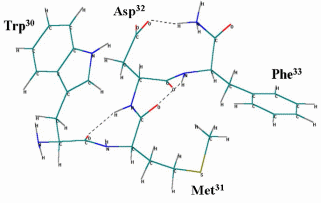 Методами молекулярного моделирования сконструирована вероятная биологически активная конформация пептида ССК-4, а также разработана пространственная модель взаимодействия лиганда ССК-4 с активным центром холецистокининового рецептора второго типа.
