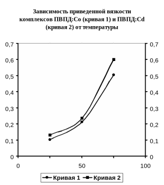2. Изучено влияние температуры на стабильность образовавшихся комплексов. Было выяснено, что повышение температуры ведет к повышению приведенной вязкости, что свидетельствует о деструкционных процессах полимер-металлических комплексов.