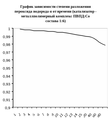 Далее мною проводились эксперименты по изучению каталазной активности полученных металлполимерных комплексов. Проверялась их ускоряющая способность реакции разложения пероксида водорода. Использовались соотношения металл: лиганд=1:1, 1:2, 2:1, 1:4, 1:6. Данные соотношения были выбраны, исходя из координационных чисел иона-комплексообразователя (у Cd и Co координационные числа могут быть 2, 4, 6). Судя по полученным данным, мы можем сказать, что использование растворов полученных металлполимерных комплексов в качестве катализаторов обоснованно, так как они ускоряют данную химическую реакцию, но нецелесообразно, так как ускорение реакции минимально. Самой высокой каталазной активностью обладают комплексы кадмия в соотношении металл: лиганд=1:1 и 1:4. Комплексы кобальта же проявляют самую малую каталазную активность. Однако, если рассматривать графики №13,14,16 то можно выявить постепенное (и достаточно интенсивное для данного случая) увеличение степени разложения пероксида водорода по времени, что указывает на стабильность полученного катализатора.
