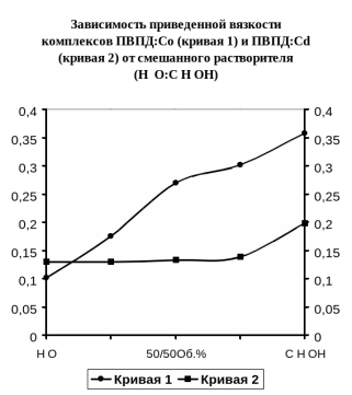 На рисунке №5 представлены кривые приведенной вязкости комплексов ПВПД-Cd2+ и ПВПД-Co2+ в зависимости от состава растворителя Н2О:С2Н5ОН. Кривая 1 (ПВПД-Co2+) отображает поведение данного комплекса от состава растворителя. Как видно из рисунка, наблюдается увеличение приведенной вязкости (от 0,1 до 0,37) с увеличением объемных процентов этилового спирта, что свидетельствует о раскручивании полимерного клубка. Кривая 2 (ПВПД-Cd2+) отображает приведенную вязкость данного комплекса по сравнению с вязкостью комплекса ПВПД-Co2+. Как видно из кривой, вязкость комплекса имеет низкие значения (от 0,13 до 0,19) вне зависимости от состава растворителя, что указывает на его высокую прочность и устойчивость к растворению органическими растворителями.