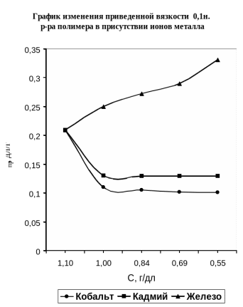 Также было проведено изучение изменения вязкости образовавшегося комплекса от температуры. Нужно отметить, что все предыдущие исследования по изменению вязкости проводились при постоянной температуре 25 °C. В данном же случае проведены исследования при 25, 40, 60°С. Как видно из построенного графика (рисунок №6) наблюдается рост приведенной вязкости с повышением температуры в обоих случаях. В перспективе же возможно выпадение осадка или же переход раствора в состояние геля. Именно поэтому при более высоких температурах измерение вязкости металлполимерных комплексов не рекомендуется, так как возможно засорение капилляра вискозиметра.