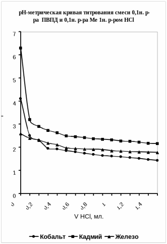 1. Методами рН-метрического титрования и вискозиметрии обнаружено и доказано комплексообразование в системе поливинилпирролидон-Cd2+ и Co2+. Обнаружено, что поливинилпирролидон не образует комплексы с железом (II) в данных условиях.