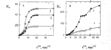 Рис. 1. Кинетика набухания ВПС в воде: а) ГПАА-1 (I); 111AA-Z (2) и ГПАА-3 (3); б) ГПАК-П2М51Ш (4) и Г'ПАК-ПБ (5)