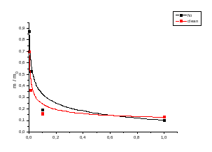 Рис. 6 Кривые ионная сила – отношение m/m0 гидрогелей АА - АК - ПЭИ чистый и с «вшитым» металлом никелем
