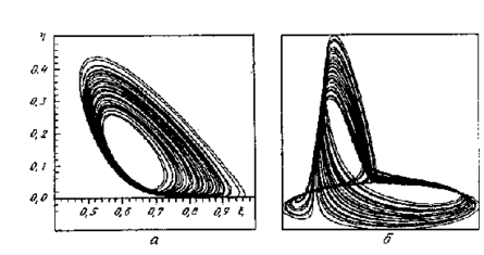 На рис.2.2.1 показан "портрет" такого аттрактора, описывающего колебания в некой химической реакции, которую моделировали на компьютере. Аттрактор на рис.2.2.2. получен при обработке эксперимента по изучению знаменитой колебательной химической реакции Белоусова-Жаботинского [14].
