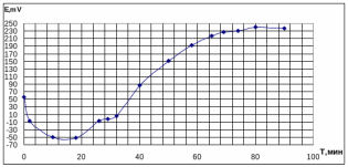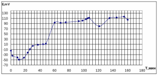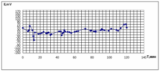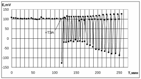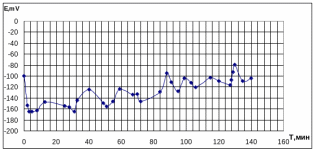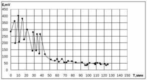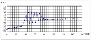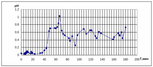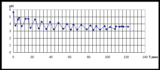 В 1994 году на кафедре ХТООС МИТХТ им. М. В. Ломоносова при исследовании окислительного карбонилирования алкинов по С-Н связи было обнаружено, что в каталитической системе PdI2-KI-МеОН процесс протекает в режиме автоколебаний [24]. Исследование реакции проводили в метаноле при следующих условиях: t = 400C, PO2 = 0,5 атм., PCO = 0,5 атм., [PdI2]0/[KI]0 = 1/40. В ходе опытов наблюдались периодические изменения значений pH и потенциала платинового электрода по отношению к хлорсеребряному электроду сравнения, а также периодическое поглощение газовой смеси (СО и О2) порциями по 1,5 – 2,0 мл.