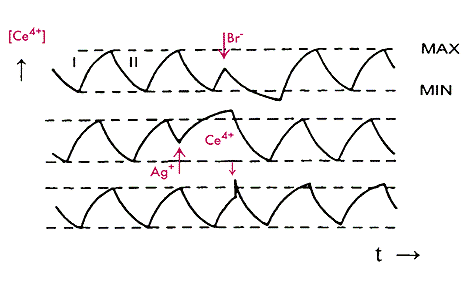 Рис.2.3.3 Автоколебания концентрации церия и принудительная смена стадий I и II, вызываемая добавкой Br-, Ag+ и Ce4+.
