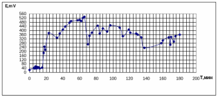 Общая методика эксперимента заключалась в следующем. В сухой термостатированный при 400С реактор с установленными электродами загружали навеску галогенида металла, служащих для улучшения растворения катализатора и метанол, перемешивали 15мин, затем загружал навеску палладиевого катализатора и перемешивали раствор ещё 25 мин. Реактор продували смесью газов СО и О2 (объём продуваемого газа не менее 500мл., состав газа в реакторе контролировали хроматографически). Затем с помощью шприца вводили через пробоотборник - фенилацетилен в метаноле, доводя общий объём раствора до 10 мл. Момент ввода алкина считали началом опыта. В ходе опыта измеряли рН и Ept, а также изменение объёма газа в реакторе. Периодически отбирали пробы реакционного газа и анализировали их методом газоадсорбционной хроматографии с использованием насадочных колонн длиной 3м, диаметром 3мм, заполненных активированным углём АР-3 (определяли содержание воздуха, СО, СО2) и молекулярными ситами 13Х (определяли содержание О2, N2, CO). И в том и другом случае использовали фракцию с размером частиц 0,25-0,5 мм, детектор-катарометр, газ-носитель – аргон.