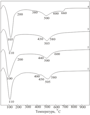 Рис. 2 – Дифференциально-термические кривые природного и модифицированного бентонитов: 1 – природного, 2 – обогащенного, 3 – модифицированного серной кислотой, 4 – модифицированного карбонатом натрия