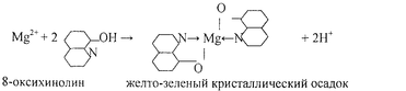 Осадок растворим в минеральных кислотах и в уксусной кислоте. Проведению реакции мешают катионы, также образующие комплексы с 8 -оксихинолином (Cu2+, Zn2+. Cd2+, Fe3+ и др.).