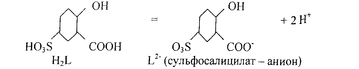 Где H2L - условное обозначение молекулы сульфосалициловой кислоты, a L- -обозначение сульфосалицилат-аниона, образовавшегося из сульфосалициловой кислоты, при отщеплении двух протонов: