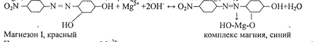 В щелочной среде магнезон I, имеющий красную окраску, образует с катионами М^2+,комплекс синего цвета, сорбирующийся на осадке Mg(OH)2: