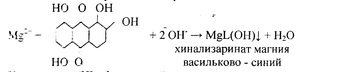 Реакцию проводят в щелочной среде. Образуется синий осадок комплексного соединения – хинализарината магния состава MgL(OH), где НL – условное обозначение молекулы хинализарина: