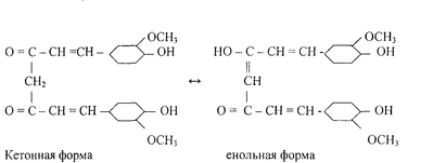 Краситель куркумин (желтого цвета) в растворах может существовать в двух таутомерных формах - кетонной и енольной, находящихся в равновесии: