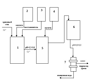 Сточные воды обрабатываются в две стадии: 1) восстановление шестивалентного хрома до трехвалентного; 2) осаждение трехвалентного хрома в виде гидроксида.