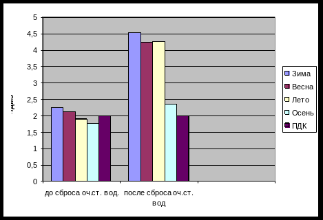 Данное предположение подтверждается снижением уровня содержания растворенного кислорода, по сравнению с ПДК в речной воде после сброса - зимой – на 5; весной – на 19, 8 %.
