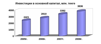 За 2008 г. объем инвестиций в основной капитал по сравнению с 2007 г. возрос на 4,6% и составил 3,8 трлн. тенге.