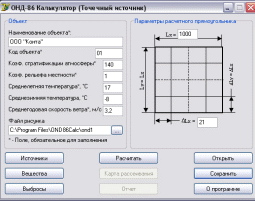 Для оценки состояния атмосферного воздуха использовалась специализированная программа «ОНД-86 Калькулятор» версии 1.0, которая предназначена для оценочного расчета выбросов вредных веществ из точечных источников. В программе использована библиотека построения линий Demo Controll Dill.