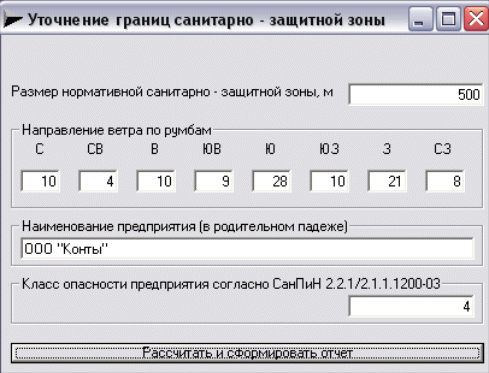 Для уточнения размеров санитарно-защитной зоны предприятия ООО «Экос» была использована специализированная компьютерная программа «Уточнение границ санитарно-защитной зоны предприятия». Для проведения расчетов в этой программе необходимо внести следующие исходные параметры: размер нормативной санитарно-защитной зоны, направления румбов ветра по сторонам света и класс опасности предприятия.