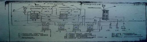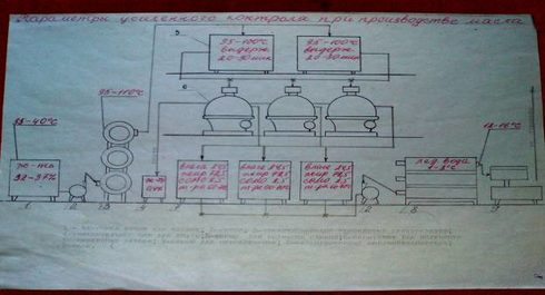 1 - приймальна ванна для вершків; 2 - насос; 3 - трьохступеневий трубчастий пастеризатор; 4 - урівнювальна ємкість для пахти; 5 - ванни для витримки вершків; 6 - сепаратор для отримання високожирних вершків; 7 - ванни для нормалізування; 8 - циліндричний маслоутворювач, 9 - ваги.