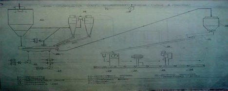 18 - вентилятор, 19 - віброжолоб, 20 - віброслюідний жолоб, 21 - накопичувач, 22 - електронні ваги, 23 - зшиваюча машина. 24 - продуктопересувач, 25 - сушильна башня, 26 - циклони, 27 - вентилятор, 28 - дозатор продукту, 29 - транспортер відправки на склад продукції.