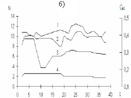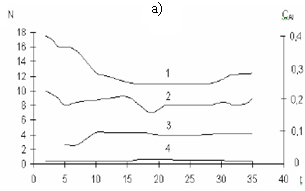 Рис. 1.2 - Зависимость мутности воды N (мг·л–1) (1-3) и концентрация остаточного алюминия в фильтрованной воде с Al (мг·л–1) (4) от времени t (ч) для фильтроциклов по очистке р. Томи на пилотной установке фирмы Preussag Noell, а - для гидроксосульфата алюминия (2 мг·л–1 Al2O3) и ВПК-402 (0.2 мг·л–1); б - для сульфата алюминия (2 мг·л-1 Al2O3) и ПАА (0,2 мг·л–1). Вода: 1 - исходная, 2 – осветлённая, 3 – фильтрованная
