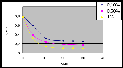 Начальные скорости осветления суспензии каолина закономерно повышаются при увеличении концентрации полиэлектролита. Скорость осветления в присутствии полимерных добавок выше в 3 – 4 раза, чем скорость осветления в отсутствие полимеров. Наибольшие значения скорости достигаются при дозах 0,05-0,10 мг/г.