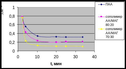 Сравнивая параметры кинетической устойчивости сополимеров АА с МАГ и ПАА, можно видеть, что сополимеры проявляют значительно большую активность, судя по значениям объема и времени уплотнения осадка. Исходя из известных закономерностей динамики дисперсий, можно предположить, что под действием сополимеров образуются флокулы большего размера или большей плотности, чем в присутствии полиакриламида.