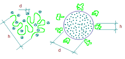 Рис. 3.2 - Влияние соотношения размеров макромолекул и коллоидных частиц на процесс флокуляции: а) макромолекулы намного больше коллоидных частиц; б) коллоидные частицы намного больше макромолекул; h- статистический размер макромолекул, d-размер коллоидных частиц