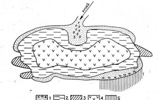 Уламкові осади: 1 - галька, піски; 2 - глинисті, вапнякові й інші голки; 3 - органогенно-детритові (рослинні) голки. Хемогенні осади: 4 - тонкі органогенні (діатомові) голки; 5 - крутий берег