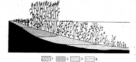 Рисунок 3.1. Схема заростання озера й утворення торфів: 1 - осоковий торф; 2 - очеретяний і очеретяний торф; 3 - сапропелевий торф; 4 – сапропеліт