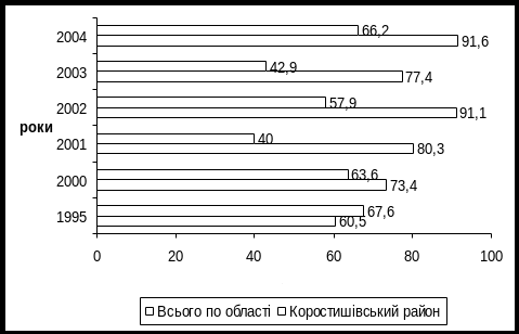 | Коростишівський | 1,6 | 1,2 | 1,1 | 29,6 | 27,9 | 57,9 | 77,1 | 89,1 | 91,4 | 11,6 | 1,3 | 13,2 | |||