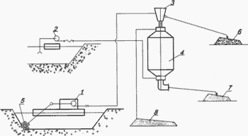Для розробки підвідних родовищ використовують плавучі установки, називані землесосними снарядами або земснарядами. Вони являють собою понтон, переміщуваний і фіксований у визначеній позиції за допомогою тросів, якорів і пальових пристроїв. На понтоні розташовується землесос - могутній насос відцентрового типу. На дно опускається усмоктувальний пристрій землесоса і при необхідності механічний розрихлювач. Землесос і розрихлювач працюють спільно, причому розпушений пісок разом з водою засмоктується в трубу й у виді пульпи (гідросуміші) транспортується по плавучому пульпопроводу, що збирається з ланок труб на поплавцях.