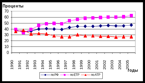 Из таблицы видно, что вклад выбросов этих городов в промышленные выбросы на всей территории России практически не меняется (в 1990 г. – 28,4 %, в 2005 г. – 28,1 %).