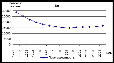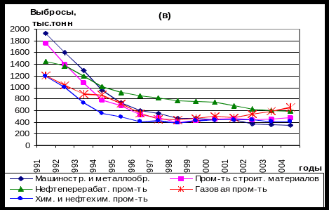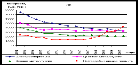 На рисунке 7 (а–г) (см. рис. 5)представлена динамика выбросов загрязняющих веществ в атмосферный воздух от стационарных источников с 1991 по 2004 годы. На рисунке 7 (а) – представлена динамика суммарных выбросов (всего) загрязняющих веществ по промышленности России в целом. На рисунке 7 (б) – представлена динамика суммарных выбросов по 4 отраслям промышленности России: электроэнергетика, цветная металлургия, черная металлургия и нефтедобывающая промышленность.