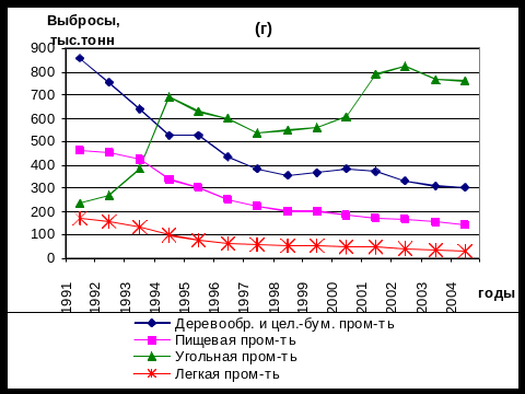 На рисунке 7 (г) – представлена динамика выбросов еще по 4 отраслям: деревообрабатывающая и целлюлозно-бумажная промышленность, угольная промышленность, пищевая промышленность и легкая промышленность.