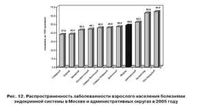 Рис. 1.2 – Распространенность заболеваемости взрослого населения болезнями эндокринной системы в Москве и административных округах в 2006 году